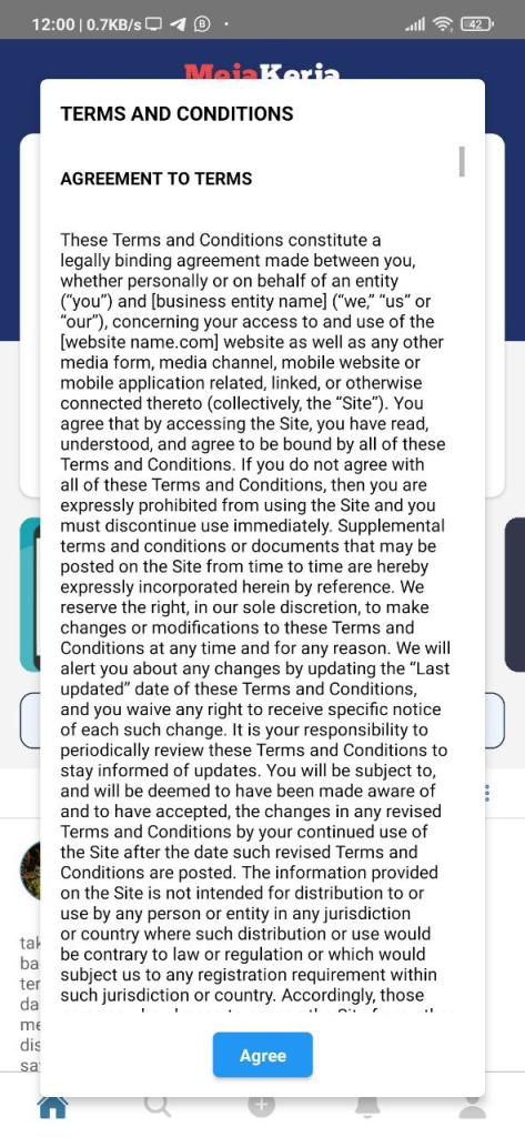 Jika subcompany anda telah mengatur Terms And Conditions, maka di halaman dashboard anda akan melihat Terms and Conditions terlebih dahulu.